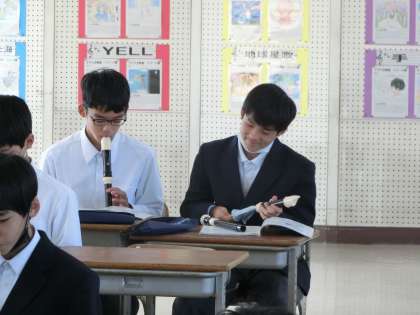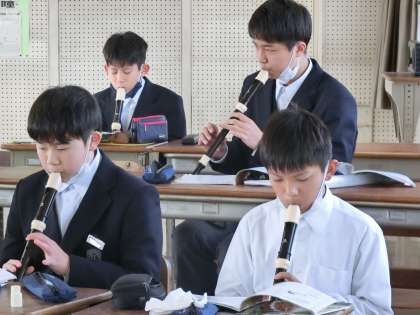 リコーダー演奏の練習に取り組んでいました。リズム、指使い、タンギングなど、いろいろな方法で演奏できるように頑張っていました。