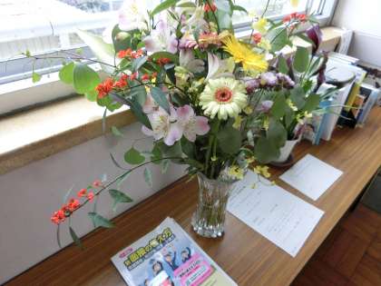 3年生が生活するフロアの廊下のテーブルには、きれいな花が生けられています。学年主任が定期的に換えているものです。生徒たちの癒しの空間の一つになっています。