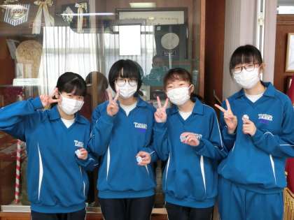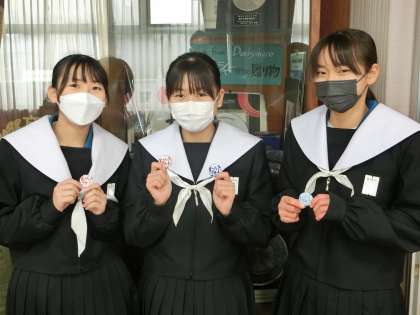 写真は、昨日の給食後、校長室で2年生の該当生徒が受け取りに来た時の様子です。ボランティアで活動したことをひけらかすわけでもなく、純粋に缶バッジをもらえることを喜んでくれる高中生。本当に自慢の生徒たちです。