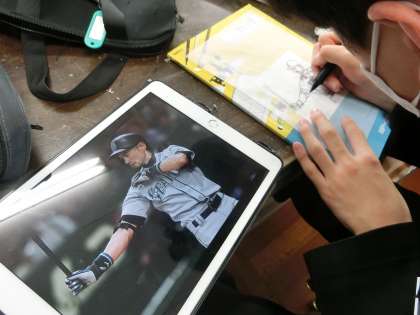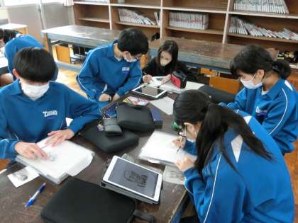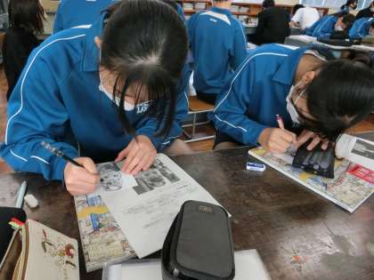 点描画での作品「万年カレンダー」の制作に取り組んでいます。今回は「人物の描き方を学ぼう」がテーマです。お気に入りの人物をトレーシングペーパーに写していきます。中にはすでに点描の作業を始めている生徒もいました。