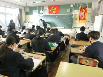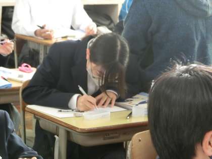 垂直二等分線の作図の仕方について学んでいました。単に作図の手順を覚えているだけだと、いざという時に思い出すことができないため、コンパスを使う意味やどんなことに気をつけて作図をしていくのかをしっかり理解してほしいと思います。