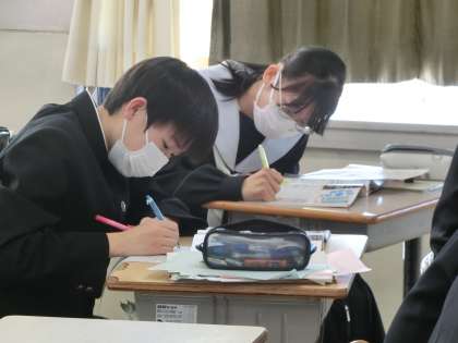 12/21 3-2 国際連合の役割 2 公開日 2023/12/21 更新日 2023/12/21 各学年から 3年2組の社会・公民分野の授業の様子です。 「国際連合の役割」について学習が進められていました。事前に調べた内容を積極的に発表したり、仲間に確認したりして、知識を確かなものにしていました。