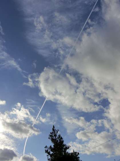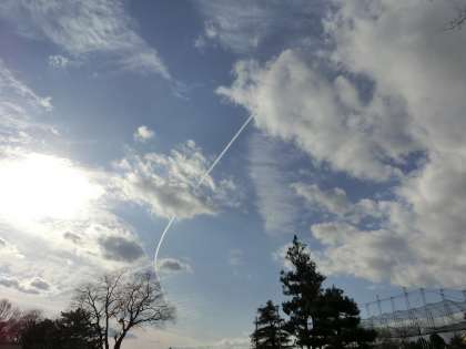 雪の心配をして空を見上げましたが、鮮やかな飛行機雲に見とれてしまいました。