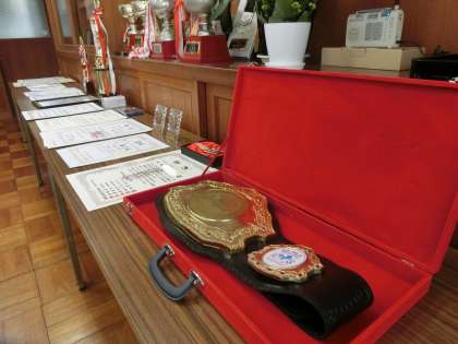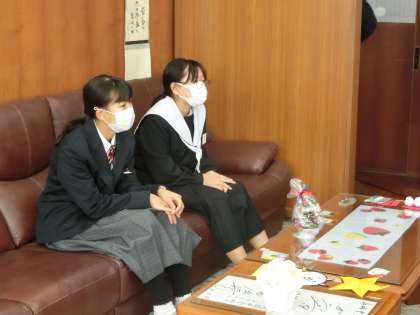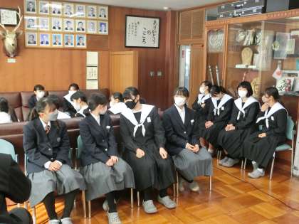 開始時間に合わせ、受賞生徒や意見発表をする学年代表生徒が校長室に集まってきました。緊張しているように見えます。