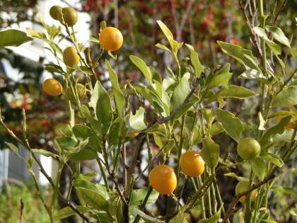 本校の東門(通称:青門)から3年生の昇降口に通じる通路にある金柑(キンカン)の木。その実も大きくなり、黄色く色づいるものを見かけました。