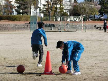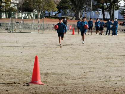 男子ハンドボール部の活動の様子です。今年最初の練習は運動場で行われていました。女子の練習でコートがあくまで、基礎メニューに取り組んでいます。その後のシュート練習でも正月休みを感じさせない豪快なシュートをたくさん見ることができました。