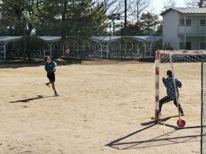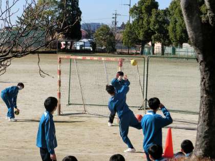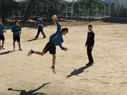 男子ハンドボール部の活動の様子です。今年最初の練習は運動場で行われていました。女子の練習でコートがあくまで、基礎メニューに取り組んでいます。その後のシュート練習でも正月休みを感じさせない豪快なシュートをたくさん見ることができました。