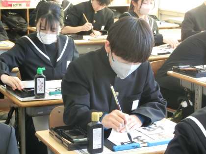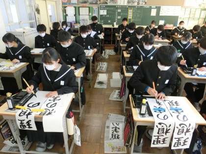 1/9 34 筆に思いを込めて… 2 公開日 2024/01/09 更新日 2024/01/09 各学年から 本日の2・3時間目に行われた書き初め大会・3年4組の様子です。 3年生の題目は「理想の実現」。多くの生徒が入試を間近に控え、4月からの新しい環境での生活を想像しながら筆を走らせていました。