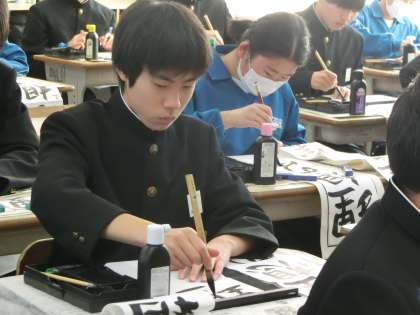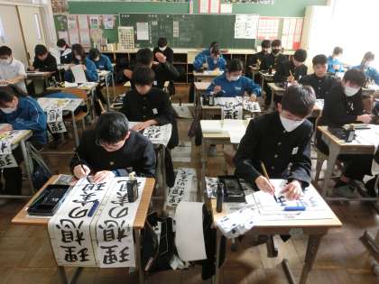 1/9 32 筆に思いを込めて… 2 公開日 2024/01/09 更新日 2024/01/09 各学年から 本日の2・3時間目に行われた書き初め大会・3年2組の様子です。 3年生の題目は「理想の実現」。多くの生徒が入試を間近に控え、4月からの新しい環境での生活を想像しながら筆を走らせていました。