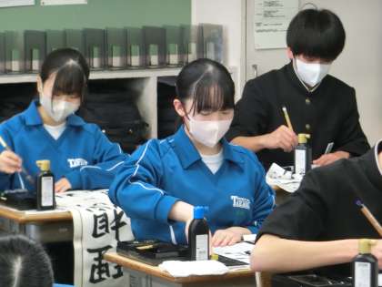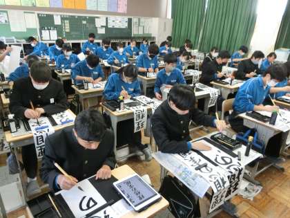 3年生の題目は「理想の実現」。多くの生徒が入試を間近に控え、4月からの新しい環境での生活を想像しながら筆を走らせていました。