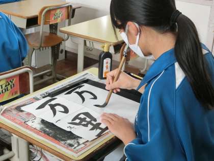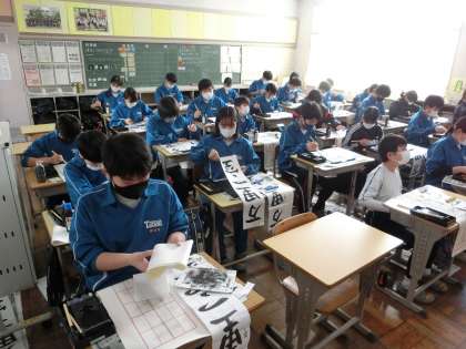 1/9 13 黙々と筆を走らせ… 1 公開日 2024/01/09 更新日 2024/01/09 各学年から 本日の2・3時間目に行われた書き初め大会・1年3組の様子です。 1年生の題目は「万里一空」。これまでの練習の成果を発揮しようと黙々とと取り組んでいました。 題目の文字には「一つの目標に向かって努力し続けること」という意味があります。これからの課高岡中を引っ張っていくべき目標を見据え、力も十分に蓄えていってほしいと思います。