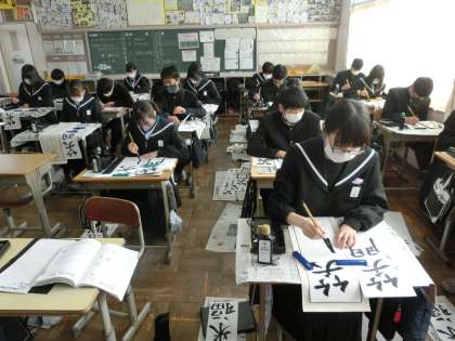 本日の2・3時間目に行われた書き初め大会・2年3組の様子です。