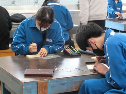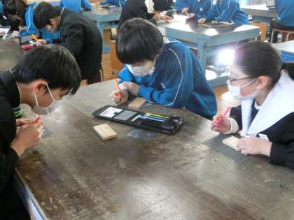 1/10 23 木彫マスターになろう! 2 公開日 2024/01/10 更新日 2024/01/10 各学年から 2年3組の美術の授業の様子です。 木彫での作品づくりに入るにあたって、「木彫マスターになろう」をテーマに彫刻刀の安全な使い方、様々な彫り方の練習に取り組んでいました。納得のいく作品づくりには、まずはしっかりとした技術も必要です。限られた時間で確実にマスターし、素晴らしい作品づくりに挑戦してほしいと思います。