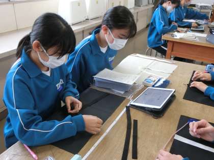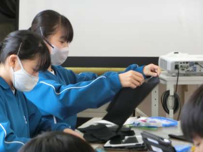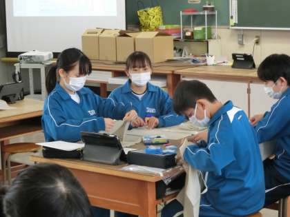 裁縫の学習で「エコバッグ」の製作に取り組んでいました。中学生になり初めての家庭科での実習。作業の手順を映像や仲間としっかり確認しながら活動を進めています。完成後に地球にやさしい買い物ができるよう、しっかりと製作に取り組んでほしいと思います。