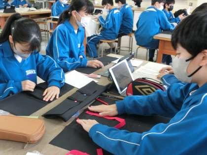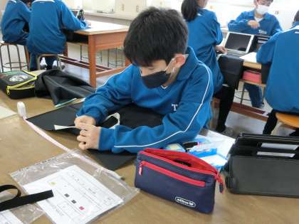裁縫の学習で「エコバッグ」の製作に取り組んでいました。中学生になり初めての家庭科での実習。作業の手順を映像や仲間としっかり確認しながら活動を進めています。完成後に地球にやさしい買い物ができるよう、しっかりと製作に取り組んでほしいと思います。