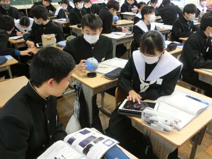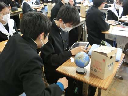 「夜空に見られる星座は、1年を通してどのように変化するのだろうか?」をテーマに学習が進められていました。地球儀を用いたり、学習用タブレットのアプリで宇宙全体での地球の位置関係を確認しながら、変化の様子について調べていました。