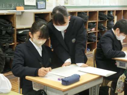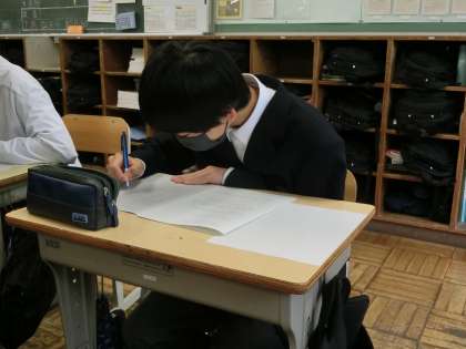 2月に実施される学習診断テストに向けて、冬休み明け最初の授業から取り組んでいます。定期テストより出題範囲が広く、夏休み前に学習した部分は記憶が薄れていることもあります。そうした部分や理解が不十分なところを仲間や教科担任と一緒に克服していきます。
