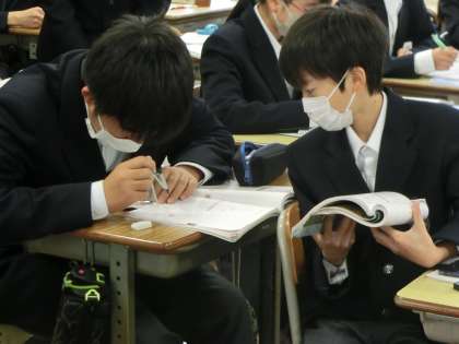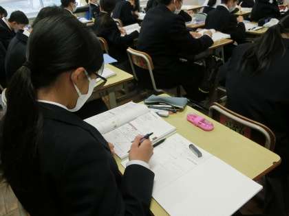 「垂線の作図の仕方」について学んでました。コンパスと定規を使い、その手順を覚えていきます。また、分度器を使わずに60度、45度、30度をかいていく方法を仲間と考えていました。