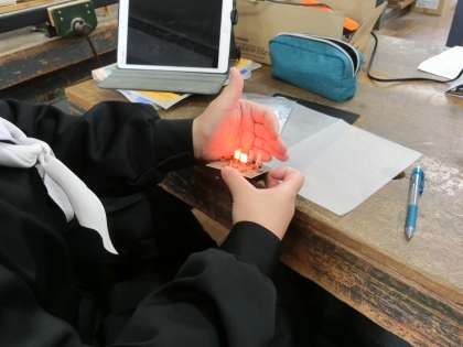 キャンドルライトづくりに取り組んでいました。細かな部品を組み立てた本体はおおよそ完成し、今回はそれを包む傘の部分の製作です。自然教室の立志式で使用するものとあって、お気に入りの言葉や模様を丁寧に書き込んでいました。