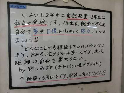 1/15 1年 学年教師からのメッセージ 公開日 2024/01/15 更新日 2024/01/15 各学年から 今週のホワイトボードメッセージです。 2年生の自然教室、3年生の私立高校の受験に触れ、1年生のがんばるべきことが書かれています。 どんなことでも継続していれば力になります。 だから、金メダルは重いんです。 走った距離は、自分を裏切らない。 2週間後の学習診断テスト、総合学習で立てた自分自身の目標に向かって、こつこつと努力を重ねてほしいと思います。
