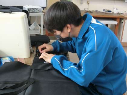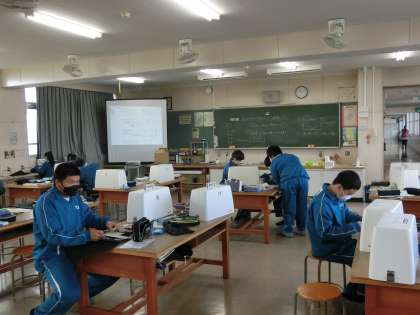 裁縫の学習で「エコバッグ」の製作に取り組んでいました。中学生になり初めての家庭科での実習。作業の手順を仲間としっかり確認しながら活動を進めています。ミシンの操作も誰もが手際よく進めています。仲間とお互いに見合うことで、しっかりと活動に取り組めていることが伝わってきました。