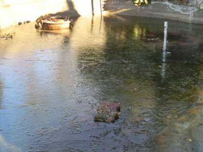 正門入ってすぐ右にある本校の池。昨日の午前中、ずっと凍ったままでした。