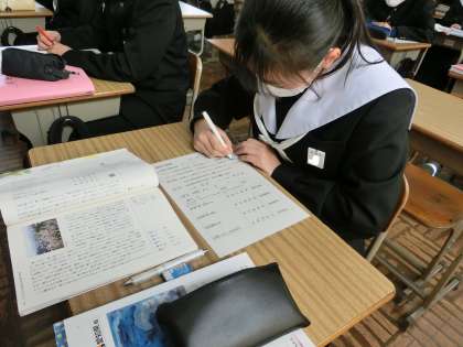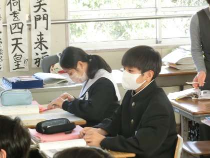 「漢詩の風景」という単元で、「漢文の基礎知識」について学んでいました。絶句・律詩などの種類や送り点・送り仮名の位置などを覚えていきます。読む順序もしっかりマスターするなど、今後の学習でも気を抜かず、しっかり学習してほしいと思います。