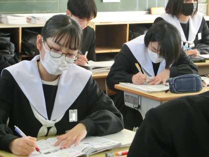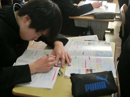 入試を目前にし、公民分野のテキストやプリントで総復習に取り組んでいました。
