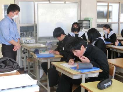 本日は、私立・専修学校の推薦入試のため、クラスの3分の1の生徒が不在です。そこで、公立入試に向けた学習が展開されていました。仲間と教え合ったり、自分のペースでどんどん問題を解いたり…。 いつでも質問できる安心感と仲間が入試本番で頑張っていることを想像することで、勉強もはかどっているようでした。