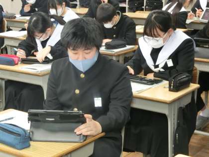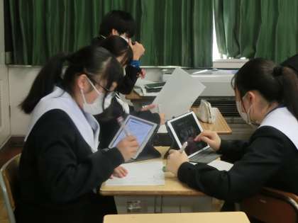 「説得力のある構成で伝えよう」という単元で「話題について、信頼性の高い情報を集めよう」をテーマに学習が進められていました。各自のテーマに沿って、できるだけ多くの情報を集めていきます。説得力を意識して、どんどん調べを進めていく姿が印象的でした。