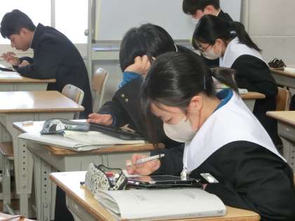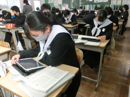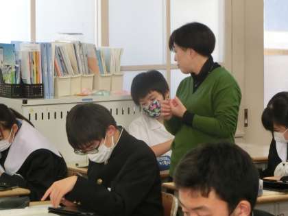 「説得力のある構成で伝えよう」という単元で「話題について、信頼性の高い情報を集めよう」をテーマに学習が進められていました。各自のテーマに沿って、できるだけ多くの情報を集めていきます。説得力を意識して、どんどん調べを進めていく姿が印象的でした。