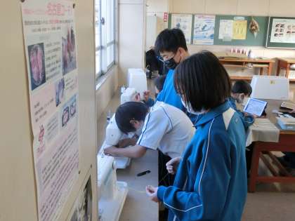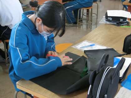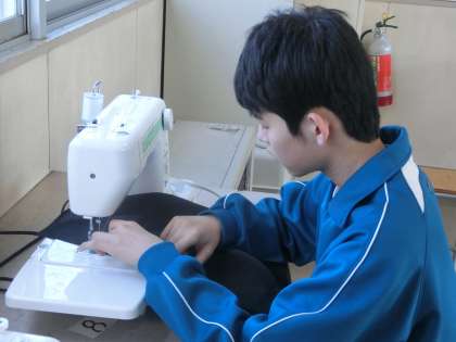 裁縫の学習で「エコバッグ」の製作に取り組んでいました。中学生になり初めての家庭科での実習。作業の手順を仲間としっかり確認しながら活動を進めています。ミシンの操作も誰もが手際よく進めています。仲間とお互いに見合うことで、しっかりと活動に取り組めていることが伝わってきました。