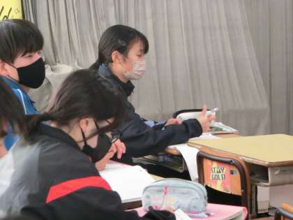 短編の読み物の内容に対する質問に答えていく学習です。耳を英語に慣らすべく、ほとんどの授業の初めに行われている活動です。