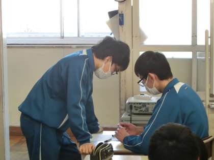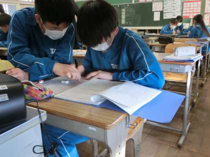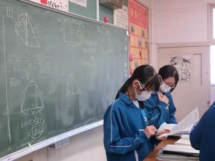 「三平方の定理」の発展問題に挑戦していました。仲間と一緒に考えたり、自力で解いた答えを正解と照らし合わせたり…。(正解したうれしさがガッツポーズに表れています)