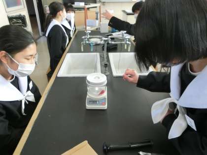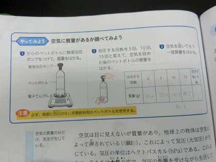 「空気に質量があるか調べよう」をテーマに実験が行われていました。簡易装置を使って容器内を真空にしていきます。容器内の空気が少なくなるにつれ、中の風船が大きくなっていきます。でもだんだん軽くなる…。 この不思議もしっかり説明できるようになってほしいと思いました。