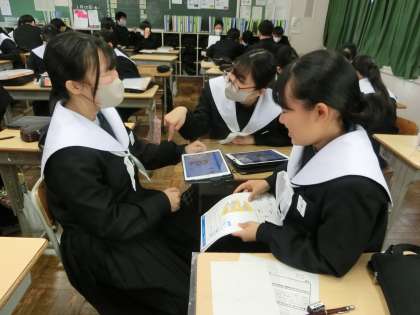 プログラミングの学習として取り組んできた「近未来メッセージアプリ」の開発。生徒たちのアイデアがいよいよ形になりました。そこで今回はそれをプレゼンしていきます。グループに分かれ、相手を惹きつけるプレゼン内容を考えていました。必要性の主張、新たな提案、最後に決めゼリフと「神プレゼン」になるよう考えていきます。どんなアプリがどのように紹介されるのか楽しみになってきました。