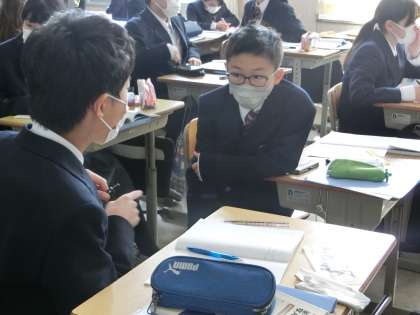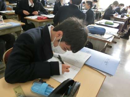 「おうぎ形について知ろう」をテーマに学習が進められていました。円の面積や円周の求め方の復習から始まり、これまで「3.14」で計算してきた円周率も「π(パイ)」で表したものに変わっていくことが伝えられていました。「π」を使った計算に勉強のレベルが上がっている感覚を受けたようで、いつもより意欲的に学習に向かっているように見えました。