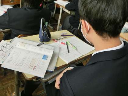 円の円周や面積を「π(パイ)」を使って計算する学習に取り組んでいました。円周率の「3.14」を使っていた時より、ずいぶんスムーズに計算できるようになり、たくさんの問題に挑戦していました。