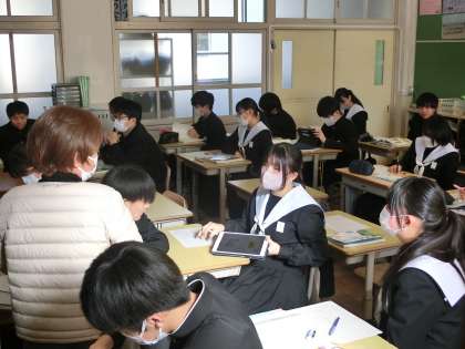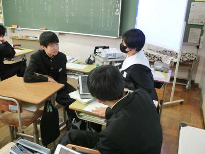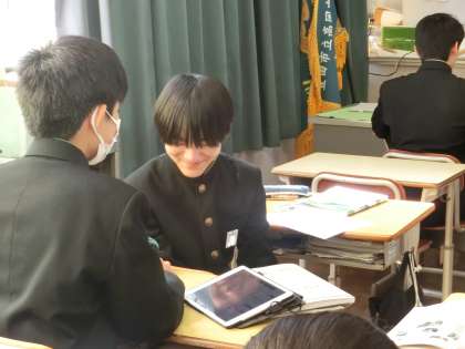 「説得力のある構成で伝えよう」という単元で「話題について、信頼性の高い情報を集めよう」をテーマに学習が進められていました。各自のテーマに沿って、できるだけ多くの情報を集めていきます。説得力ある内容にするため、どんどん調べを進めていく姿や教科担任と熱く語り合う姿が印象的でした。