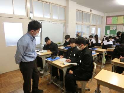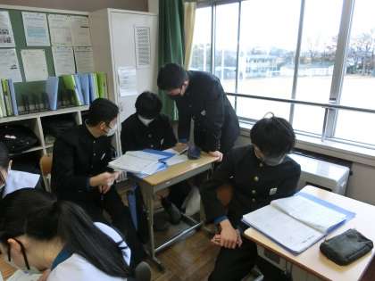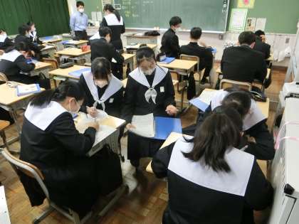 「標本調査」についての学習に取り組んでいました。標本調査とは、全体の中から一部だけを取り出して調べ、全体を推定するというもの。「○人を無作為に抽出して行った調査では〜」などといった調査のことです。身の回りでよく行われている調査の基本を学んでいました。