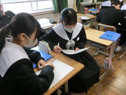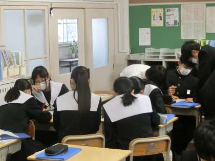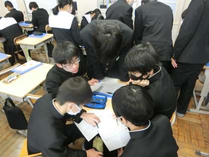 「標本調査」についての学習に取り組んでいました。標本調査とは、全体の中から一部だけを取り出して調べ、全体を推定するというもの。「○人を無作為に抽出して行った調査では〜」などといった調査のことです。身の回りでよく行われている調査の基本を学んでいました。