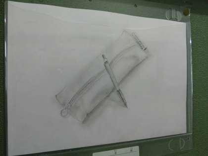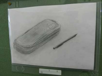 1年生の筆箱と筆記用具を題材にしたスケッチの作品が、1棟と2棟を結ぶ1階の渡り廊下に掲示されています。鉛筆だけで影をつける技術などを駆使し、本当にそこにあるかのような作品に仕上がっています。1年生が中学校に入学して初めて完成させた作品です。ご来校の際はぜひご覧になってください。
