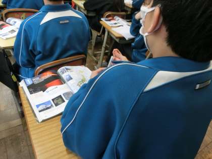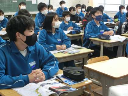 「火山の噴火と噴火物」について学んでいました。映像と合わせ、教科担任に説明を真剣に聞く生徒の表情が印象的でした。