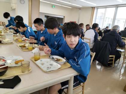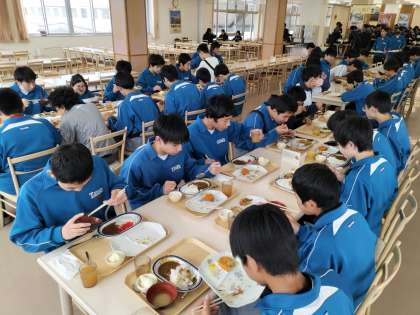 午前中の研修を終え、昼食をとる生徒たちの様子です。
