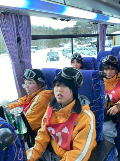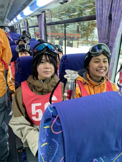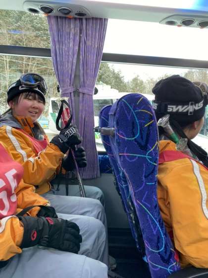 リフト代わりのバスの車内でも笑顔が弾けます。
