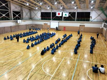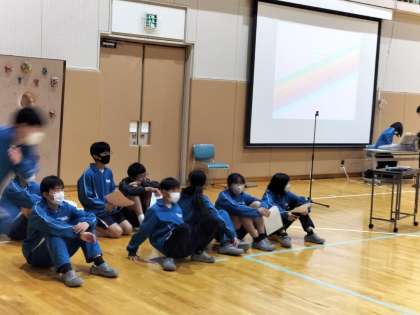 写真は、前半のお楽しみの催しである学年レクの始まる直前の様子です。係の生徒たちが、「絶対に成功させよう」と気合いを入れている最中です。