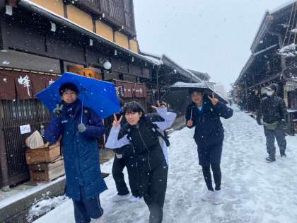 高山の古い街並みを大満喫しています。生徒にとって、雪はテンションの上がる一つのアイテムになっているようです。