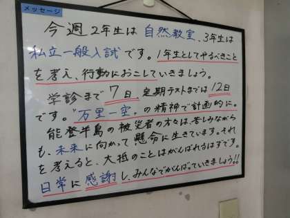 7日後の学習診断テスト、12日後の定期テストに向けて、こつこつと努力を重ねてほしいと思います。