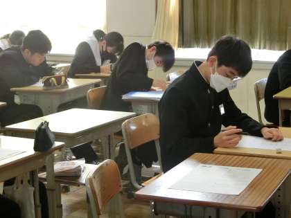 入試対策のプリントに取り組んでいました。私立高校・専修学校の一般入試を終えた生徒は中学校での学習の総復習として、今後、公立高校の入試を控えている生徒は実力をさらに伸ばすために取り組んでいます。目的は違っても、お互いを刺激し合う雰囲気に変わりはありません。