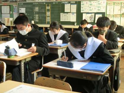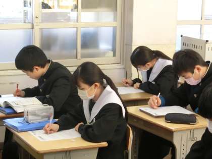 入試対策のプリントに取り組んでいました。私立高校・専修学校の一般入試を終えた生徒は中学校での学習の総復習として、今後、公立高校の入試を控えている生徒は実力をさらに伸ばすために取り組んでいます。目的は違っても、お互いを刺激し合う雰囲気に変わりはありません。